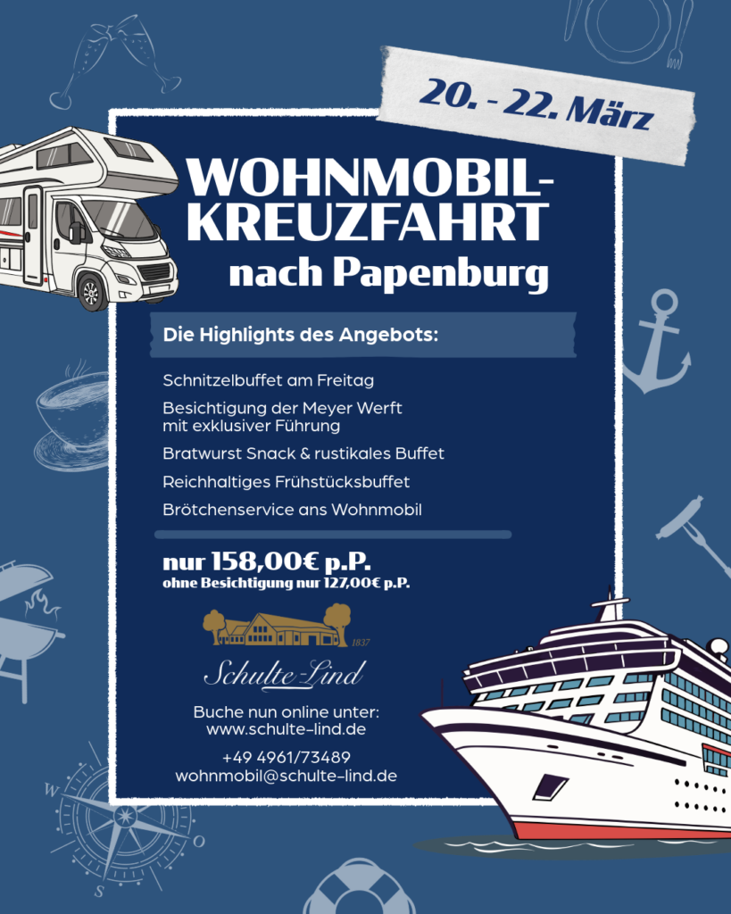 Entdecken Sie die einzigartige Kombination aus Reisen, Genuss und besonderen Erlebnissen mit unseren Wohnmobil-Kreuzfahrten in Papenburg – perfekt für alle, die mehr als nur einen Stellplatz suchen.
